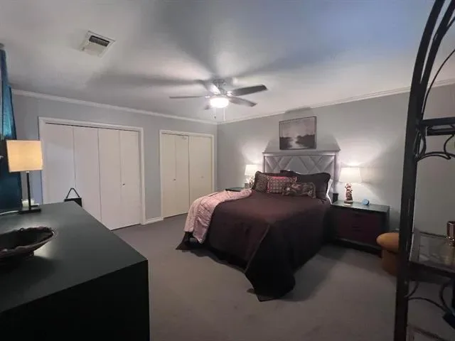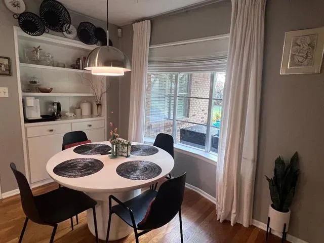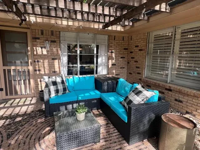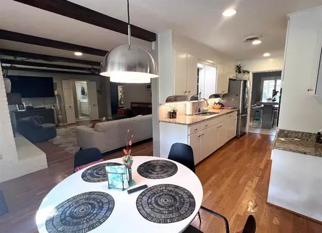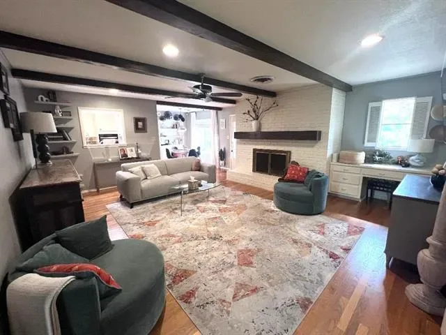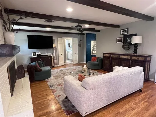 Welcome home to this beautifully maintained single-family residence where comfort, character, and thoughtful updates come together seamlessly. Spacious rooms throughout provide an open and inviting feel, while abundant storage and built-ins offer both function and charm in every corner. The family room is a true centerpiece, featuring striking wood beams and a large wood-burning fireplace that creates a warm, welcoming atmosphere. The kitchen reflects attention to detail with refaced cabinet doors and drawers, a new wall oven, and a layout designed for everyday ease and entertaining alike. Enjoy your breakfast while gazing through the bay window at the birds in the large trees. Soothing paint colors throughout the home create a calm, inviting backdrop ready for any style. The bedrooms offer a peaceful retreat with space for a seating area to create your own calming oasis. Natural light pours in through large windows, enhancing the soothing atmosphere. Spacious closets provide excellent storage, while updated bathrooms add a fresh, modern touch with convenience and style. Step outside to enjoy the lovely covered back patio overlooking a large backyard-ideal for relaxing, gatherings, or gardening. The freshly sodded front yard adds beautiful curb appeal and completes the inviting exterior of this special home.