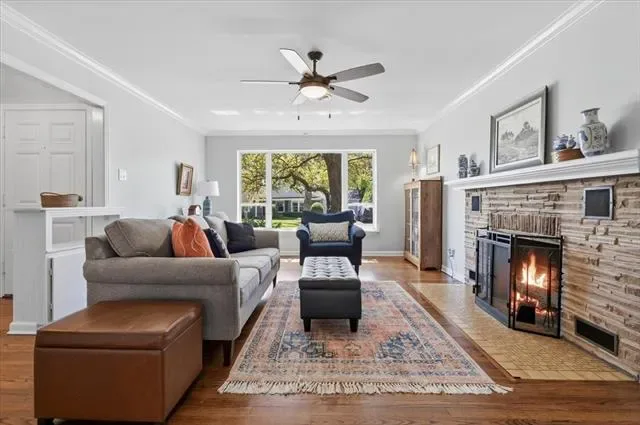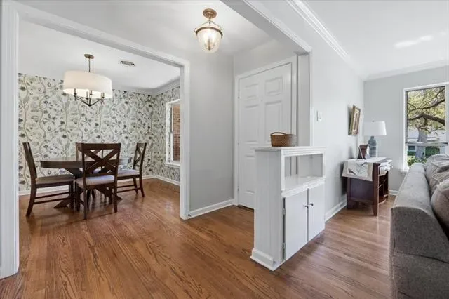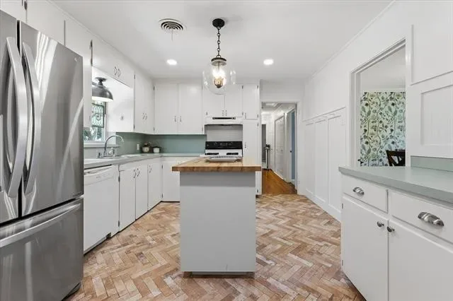 Original hardwood floors add classic appeal and flow seamlessly from the living room into the formal dining room, perfect for entertaining. The kitchen has been thoughtfully updated with new stylish brick flooring and a woodblock island, blending charm with everyday functionality.