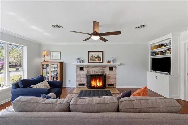 The inviting living room features custom built-ins and a cozy gas fireplace, creating a warm, welcoming focal point. From there, French doors open to a flexible bonus room ideal for a home office, library, playroom, or fitness space—highly desirable for today’s work-from-home lifestyle.