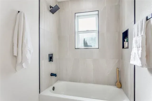 The living area is anchored by a sleek modern electric fireplace, creating a warm and stylish focal point. The custom-designed kitchen is a true showstopper, showcasing fully renovated cabinetry, luxury quartz countertops, a double sink, brand-new garbage disposal, and brand new appliances from Best Buy, including a Samsung Bespoke slide-in electric range with precision knobs. The dining area is elevated with a striking modern chandelier, adding to the home’s upscale appeal. Both bathrooms have been fully remodeled with double vanities, luxury tile finishes, modern cabinetry, quartz countertops, and new fixtures. The primary suite also features a large double closet, offering both comfort and functionality. Additional upgrades include new plumbing, electrical, doors (including the front door), a brand-new water heater, and an insulated, fully renovated garage with 4-foot LED ceiling light fixtures.