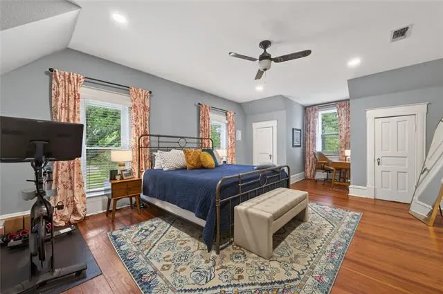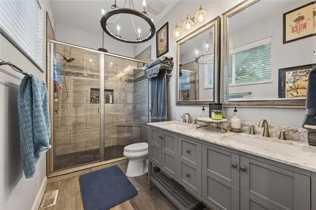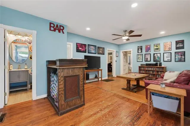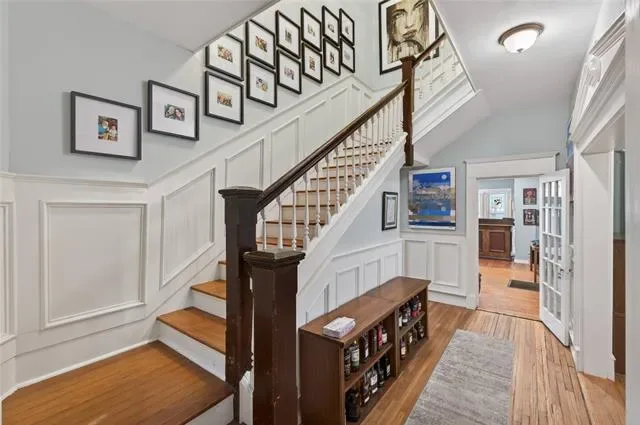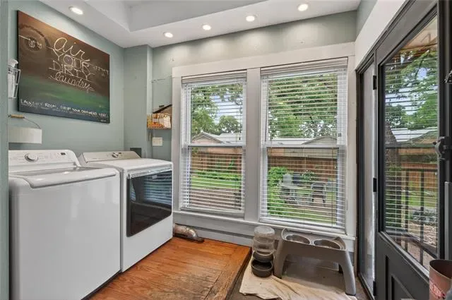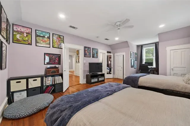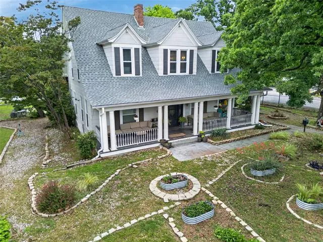 Classic 1914 architecture meets thoughtful updates on a .5389-acre corner lot with standout curb appeal, mature trees &' layered native landscaping. The wraparound porch creates an inviting entry &' extended outdoor living space, setting the tone for interiors rich with character—tall ceilings, original hardwood floors &' abundant natural light throughout. The main level offers two distinct living areas, including a spacious front living room with fireplace detail &' a relaxed secondary living space with adjacent half bath, ideal for flexible use. Two first-floor bedrooms sit side by side, with one currently configured as an expansive custom closet that flows directly into a fully remodeled full bath. A large dining area connects seamlessly to the updated kitchen, featuring stainless steel appliances, pantry storage, open shelving accents &' clean finishes. Updated electrical &' double pane windows &' no carpet help bring this beauty up to modern standards while preserving its historic integrity.