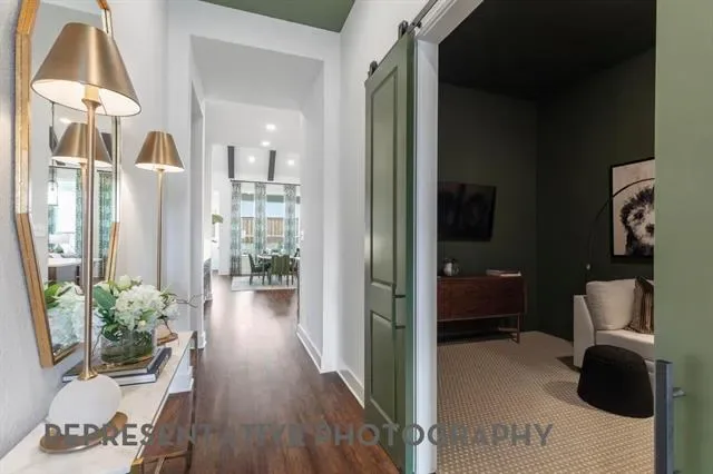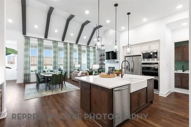 Just…wow! This new Highland home is a must see for your most discriminating buyers. Vaulted, beamed ceilings in the family and dining rooms highlight this amazing plan. Huge, extended outdoor living. Built in dining hutch, built in family room cabinets, built in utility cabinets with sink, built in mud bench. Custom kitchen with spice rack and utensil pull outs, cookie sheet dividers, trash can pull out, upper cabinet extensions with glass fronts and hidden plug molds, upgraded quartz countertops . Ledgestone fireplace in family room extends to soaring ceiling. Upgraded plumbing and lighting. Primary bath features a freestanding tub and dropped shower with frameless glass. One of the secondary baths also features a dropped, standing shower. Wood flooring throughout including the bedrooms. Only the media room and primary closet are carpeted. Whole home blinds included. Wildflower Ranch is a master planned subdivision with a lazy river, resort style pool, numerous parks and playgrounds, miles of hike and bike trails, a dog park, amenity building for functions and an onsite convenience store. HOA and lifestyle coordinator offices are also onsite as well as a Northwest ISD elementary school.