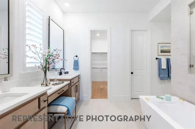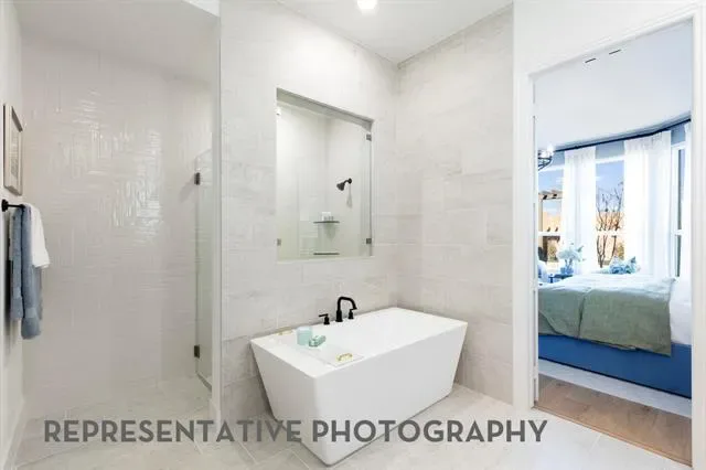 GREEBELT LOT in Wildflower Ranch. The two story dining and family room of this popular Highland Homes floorplan is highlighted by a floor to ceiling fireplace. Step through the slider doors and out into a large covered outdoor living area overlooking a forested greenbelt with creek. Cabinetry abounds in the massive kitchen and breakfast area. Primary suite features a bay window and a freestanding tub with dropped shower. Each bedroom in this home has its own private bath and upstairs bedrooms have been expanded. Cozy media room on the first floor and large game room on the second. Wildflower Ranch features an onsite Northwest ISD elementary school, lazy river, resort style pool, miles of trails, parks, playgrounds, an onsite convenience store. Pickleball and splashpad coming soon.