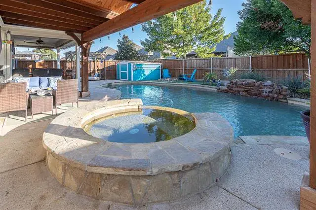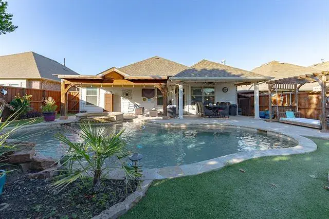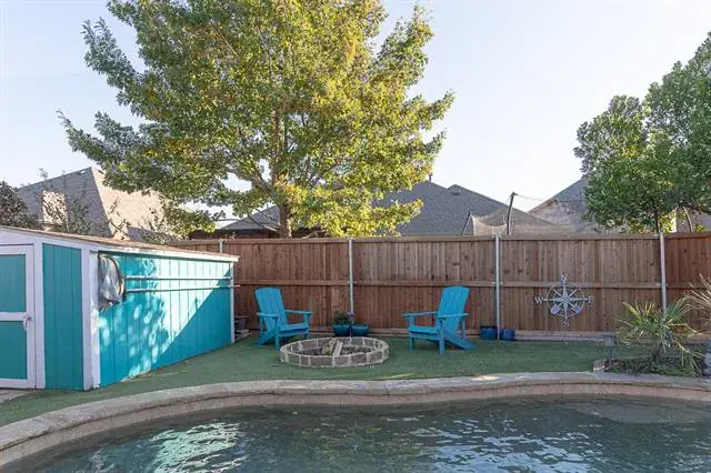Welcome to The Parks at Willow Ridge, a beautiful and well-established community in Haslet known for its peaceful streets, mature landscaping, and top-rated schools. This 3-bedroom, 2-bath home with a dedicated home office (currently used as a sitting room – would even make an ideal playroom!) offers the perfect blend of style, comfort, and everyday convenience. Step inside to an open floor plan with two dining areas and a spacious living room which includes a gas fireplace, ideal for entertaining or family gatherings. The kitchen seamlessly connects to both dining spaces, creating a warm, inviting flow throughout the main living areas. Retreat to your massive primary suite featuring a private sitting area and a custom California Closet system—a true sanctuary designed for relaxation and organization. Outside, enjoy your own backyard getaway with a sparkling pool, built in fire pit, large covered patio, and low-maintenance artificial turf, perfect for unwinding or hosting weekend barbecues. A storage shed adds practical space for tools, hobbies, or outdoor gear. This home is within walking distance to Carl E. Schluter Elementary, Leo Adams Middle, and V.R. Eaton High School! From the thoughtful floor plan to the resort-style backyard, every detail has been crafted for modern, easy living. If you’re searching for a home in Haslet with easy access to the highway, an open floor plan, home office, pool, and spacious primary suite—this one checks every box.