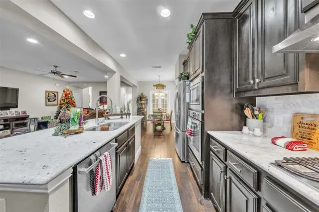 fireplace, flowing into a kitchen equipped with granite countertops and stainless steel appliances. The primary suite offers dual sinks, separate shower,