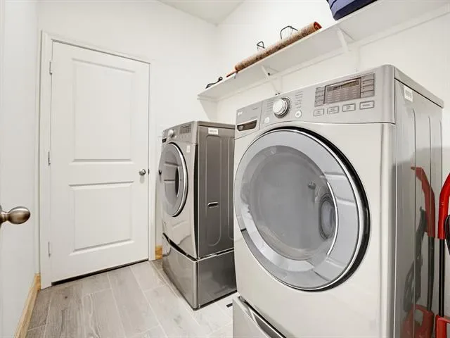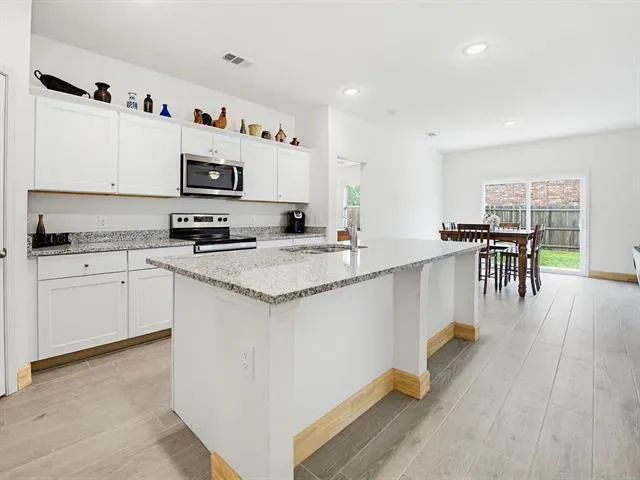 Features include wood-look tile flooring throughout, upgraded 5-inch baseboards, and abundant natural light. The kitchen stands out with stainless steel appliances, shaker cabinets, granite countertops, and a large island with an undermount sink.