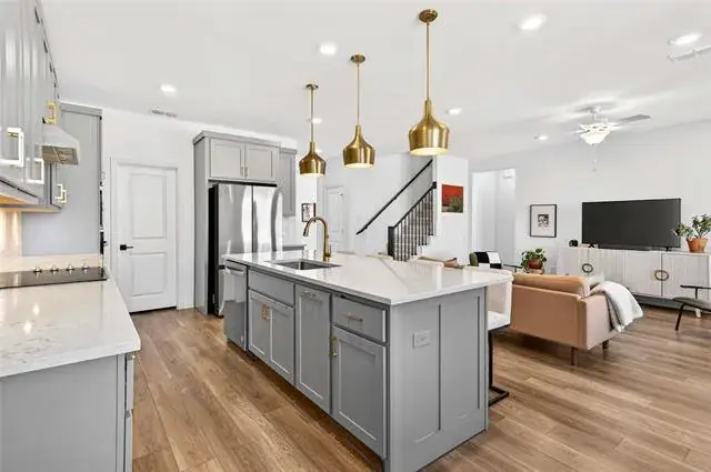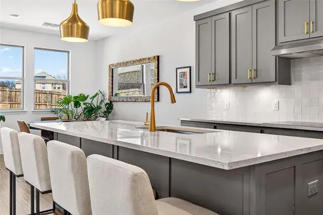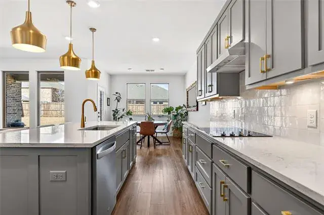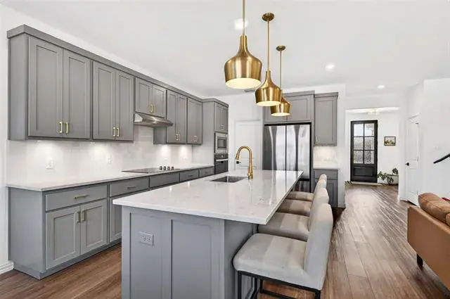 The heart of the home is a chef’s kitchen featuring an expansive island, abundant cabinetry, modern finishes, and seamless flow into the open-concept living area—perfect for entertaining or everyday living.