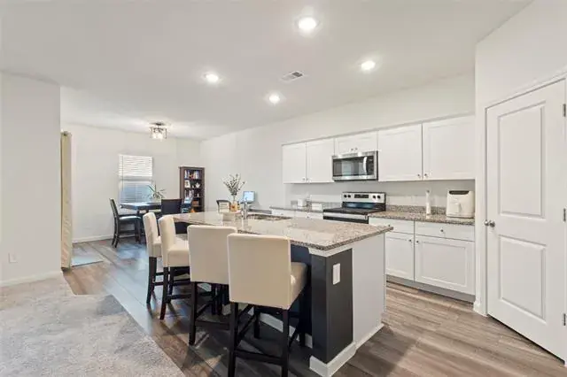 The open-concept layout is ideal for both everyday living and entertaining, with durable laminate vinyl wood-style flooring throughout the main living areas. The kitchen serves as the heart of the home and features a large kitchen island designed for both seating and food preparation, along with ample counter space and seamless flow into the living area. A designated dining area offers flexibility and can easily function as a work-from-home space or home office.