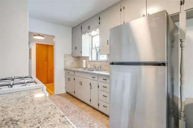 The kitchen features granite countertops and a cozy breakfast area, ideal for casual dining. This home offers three light-filled bedrooms and one and a half bathrooms, providing a functional and comfortable layout.