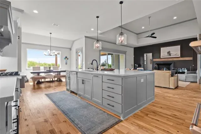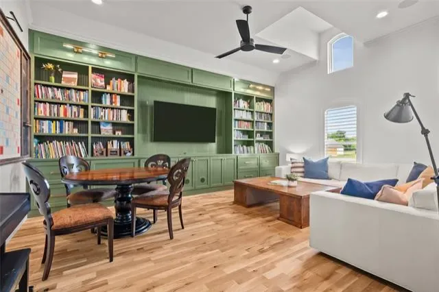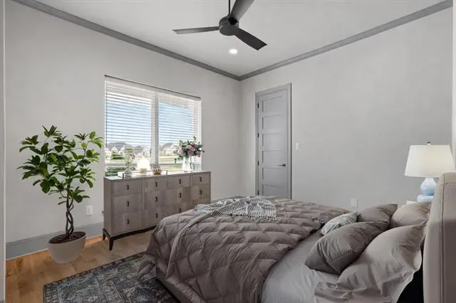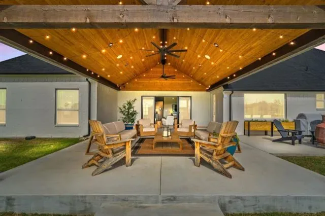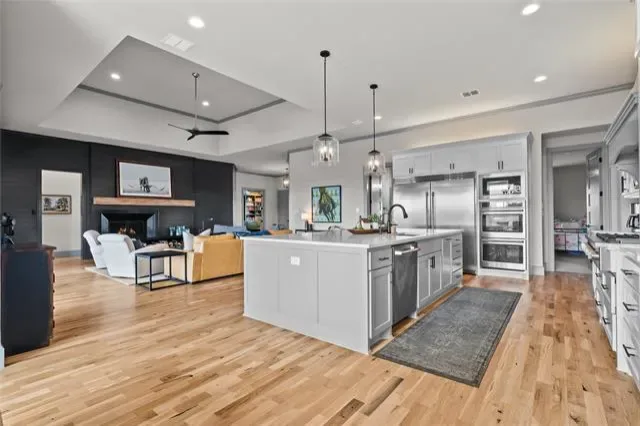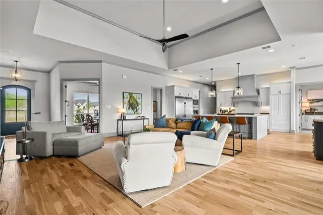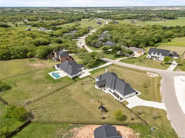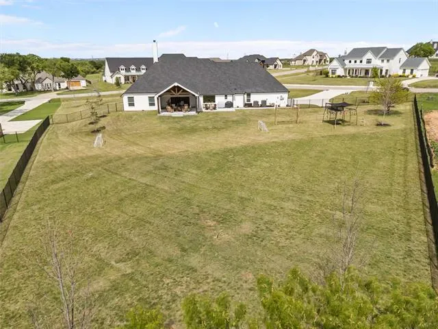 Step into elevated living in Woodland Meadows, where modern design meets wide-open space on 1.276 acres in the highly sought-after Aledo ISD. Built in 2024, this thoughtfully designed single-story home offers 3,753 sq ft with 5 bedrooms, a dedicated office, and exceptional living spaces throughout. Striking curb appeal showcases Tudor rooflines, soffit lighting, and a custom entry door opening to a bright, airy interior. Natural-stained white oak floors flow seamlessly from entry to exit, complemented by plush carpet in three secondary bedrooms. The thoughtfully designed layout offers open yet defined spaces, leading into a spacious living room anchored by a dramatic 14-foot tray ceiling, abundant natural light, and elegant finishes.