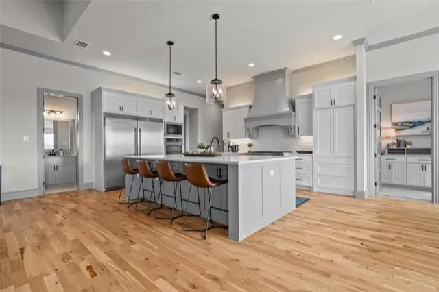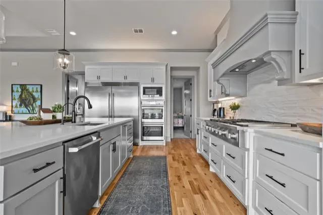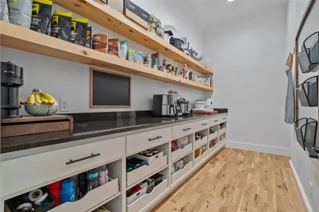 The gourmet kitchen is a true centerpiece, complete with a Frigidaire fridge-freezer combo, Café range, and a hidden double-entry walkthrough pantry with extensive custom storage.