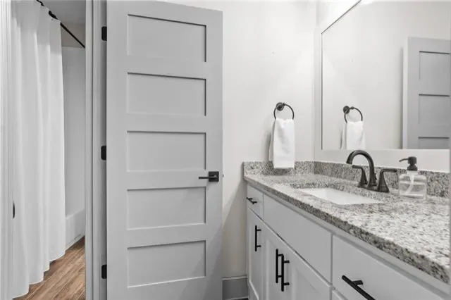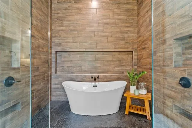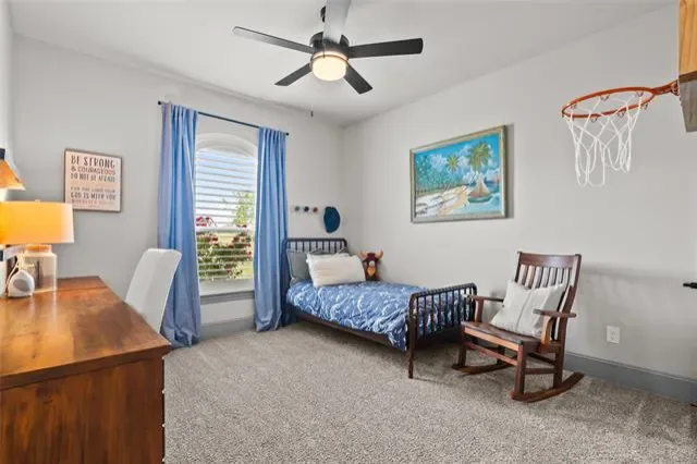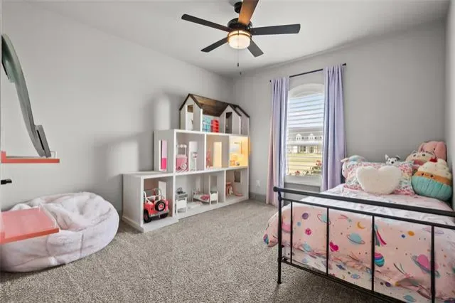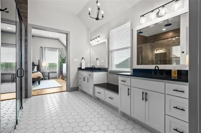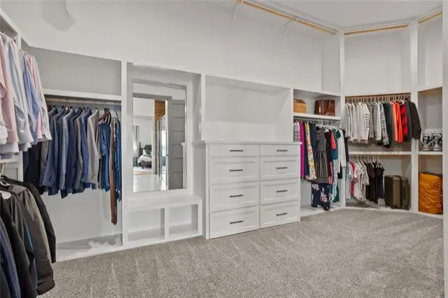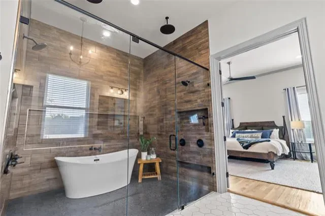 The luxurious primary bathroom offers dual vanities, a spa-like oversized walk-in shower with double rainfall shower heads, and a custom closet with built-in dresser. Secondary bedrooms are thoughtfully split from the primary, each featuring ceiling fans and generous walk-in closets.