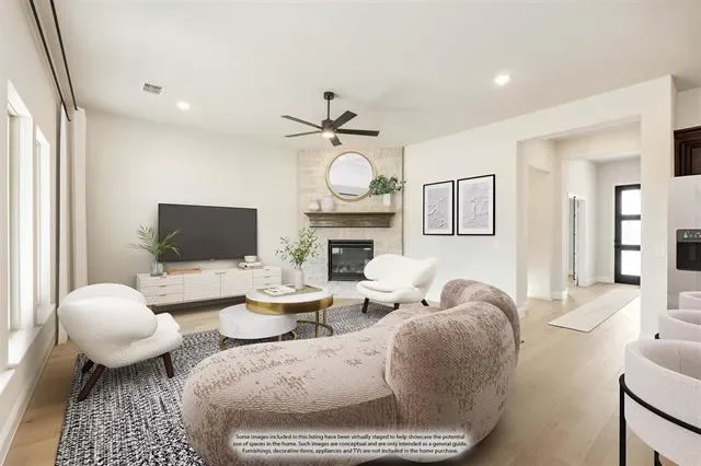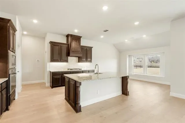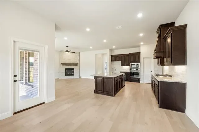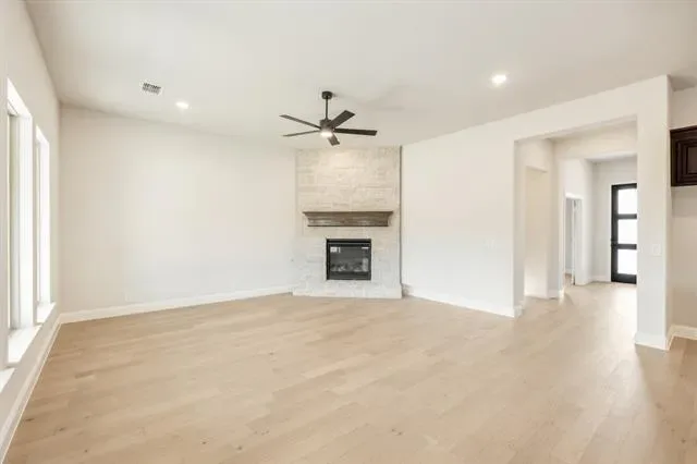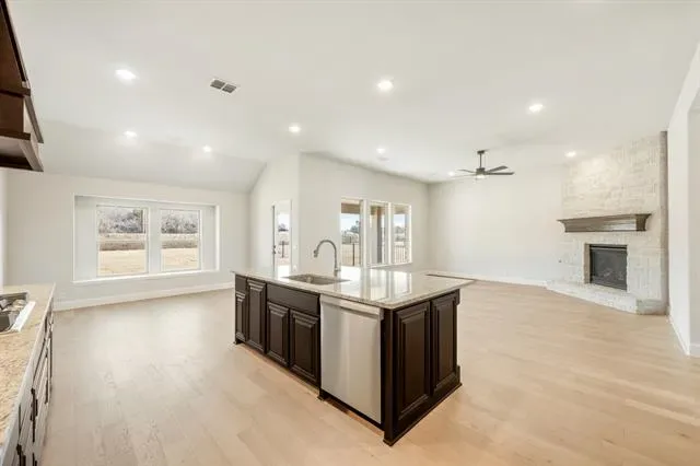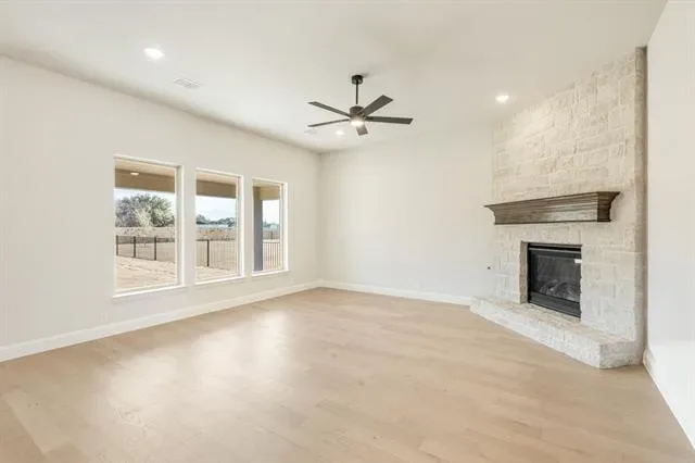 NEW! NEVER LIVED IN. Ready to Close! The Rockcress by Bloomfield Homes is a single-story plan with 3 bedrooms, 2 baths, and a 2-car garage, featuring a stone-and-brick exterior and covered front porch. Inside, Level 4 engineered wood flooring extends through the main living areas, leading to a deluxe kitchen with granite countertops, a gas cooktop, built-in oven, custom cabinetry, and a large island that connects directly to the open dining and family rooms. The family room includes a floor-to-ceiling direct vent fireplace with gas starter, creating a central gathering space. The private primary suite is located at the back of the home and includes a spacious walk-in closet and a well-appointed bath, while two secondary bedrooms are situated off their own hall with a shared full bath. A study is located near the foyer for work or flex space, and a powder bath is included for guests. Additional features include a gas water heater and energy-efficient systems. Exterior highlights include a covered patio, metal fencing for the backyard, and full landscaping, providing both privacy and outdoor enjoyment. This layout balances open-concept entertaining areas with private bedroom retreats, all within a thoughtfully designed footprint that prioritizes function, flow, and everyday comfort. Call or visit Bloomfield Homes at Abe’s Landing in Granbury today to learn more!