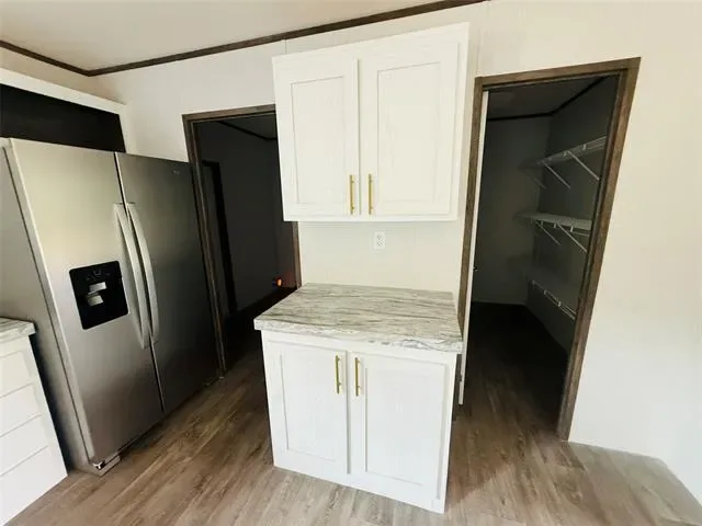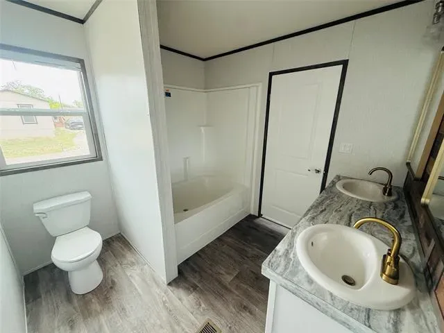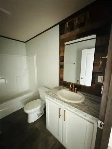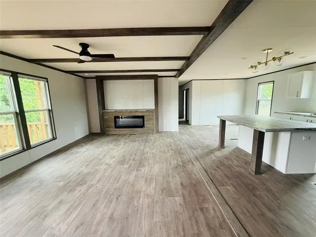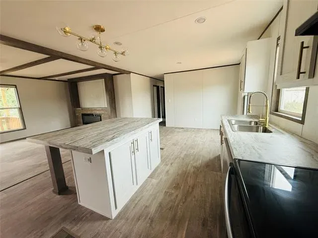 Home Features: Size: 1,474 SQ. FT. of living space. LED flushed-mounted ceiling lights throughout' Bathrooms: Both bathrooms feature fiberglass shower tub kits for comfort and style' Entertainment Center: Includes an entertainment center with an electric fireplace to create the perfect ambiance' Stylish Finishes: Brushed gold faucets and cabinet hardware, elongated toilets – hardwood cabinet doors for a premium touch' Kitchen: Stainless Steel appliances.