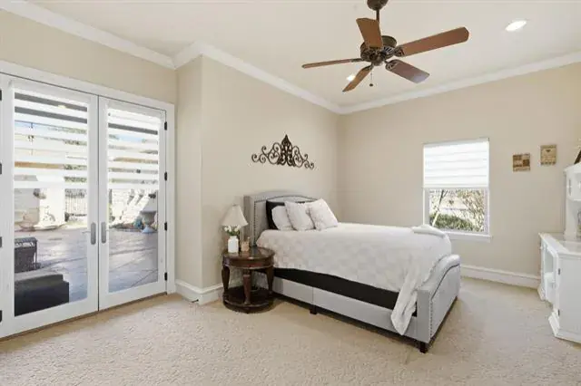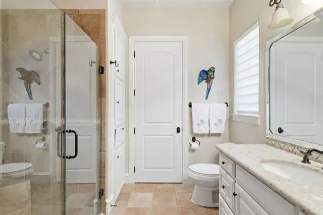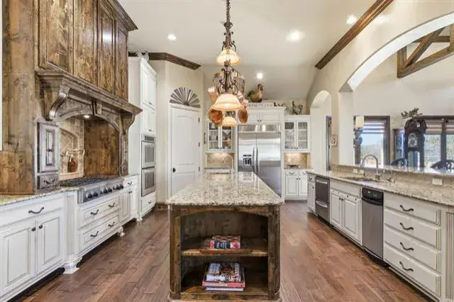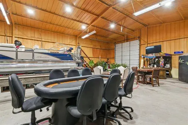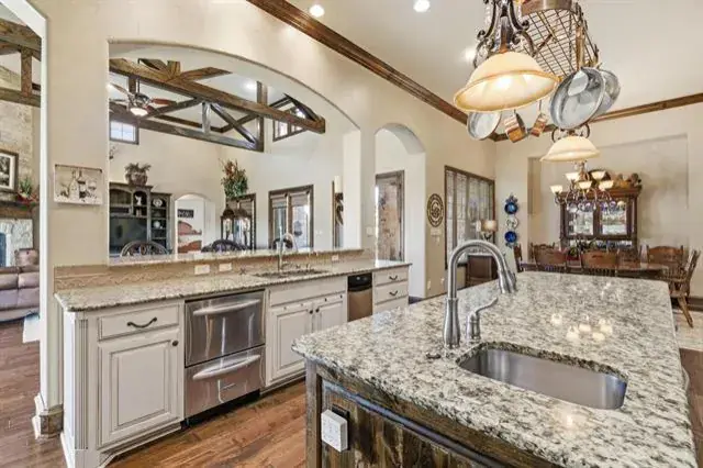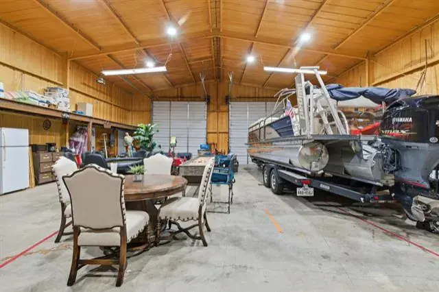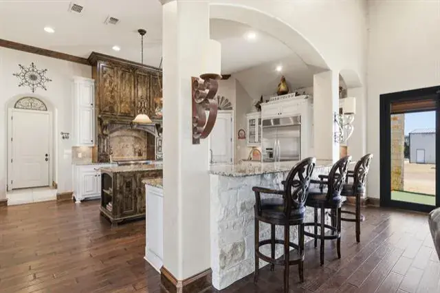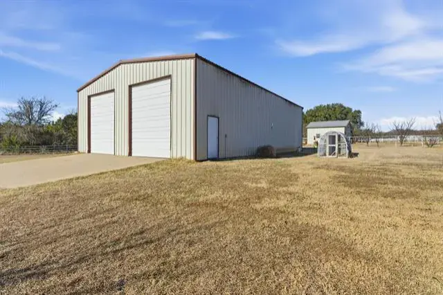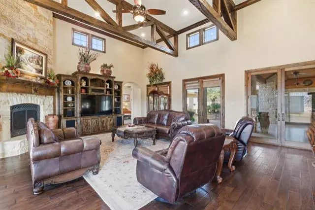 Tucked behind the gates of Blue Branch Ranch, this stunning stone estate offers a rare blend of privacy, craftsmanship, and lifestyle on 2.25 acres with horses welcome. Thoughtfully and uniquely designed, the home is centered around a peaceful courtyard anchored by a cozy see-through fireplace, creating a seamless connection between indoor and outdoor living. Inside, the impressive living area is wrapped in walls of French doors, flooding the space with natural light and showcasing soaring beamed ceilings that elevate the home’s warm, timeless appeal. The chef’s dream kitchen is both beautiful and functional, featuring a large island, breakfast bar, gas cooktop, and stunning custom Knotty Alder cabinetry. Spacious open dining area with dry bar. The primary suite wing is a true retreat, offering space, privacy, and a beautifully appointed bathroom and impressive custom closet. A large office with incredible built-ins provides an ideal work-from-home setting. The secondary bedroom features an ensuite bath and private access to the courtyard. The home also has a private guest suite with a sitting room and 1 bedroom with ensuite bath, accessed off of the courtyard, making it perfect for guests or multigenerational living. Completing the property is an outstanding 40×60 insulated workshop with three 15-foot doors, and 30 and 50 AMP RV hookups, to house all your toys, equipment, or hobbies. Ready for your dream pool! The property has a buried propane tank as well as a 2500 gallon storage tank for the well. Just minutes from Historic Downtown Granbury and Lake Granbury, the community offers riding trails, multiple stocked ponds, and a peaceful, country-luxury lifestyle.