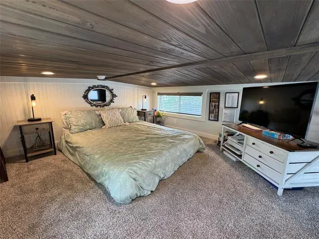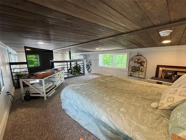 Inside features a custom designed layout with a main-floor bedroom, full kitchen, bathroom, and washer-dryer. Upstairs, a cozy 10×10 loft includes a king-size bed, TV, and seating area with approximately 4-foot ceilings—perfect for relaxing while enjoying peaceful lake views.