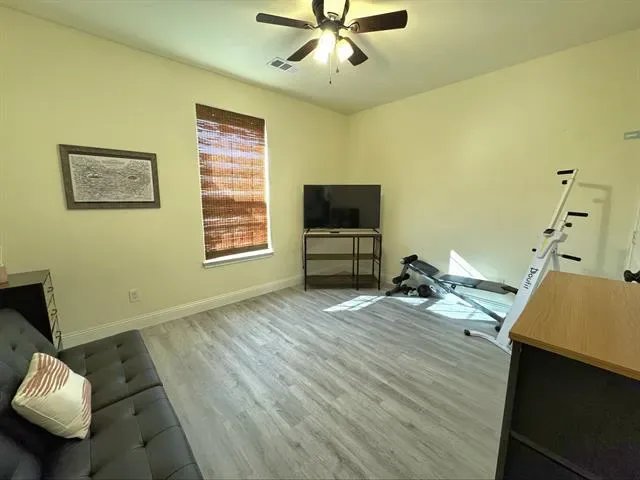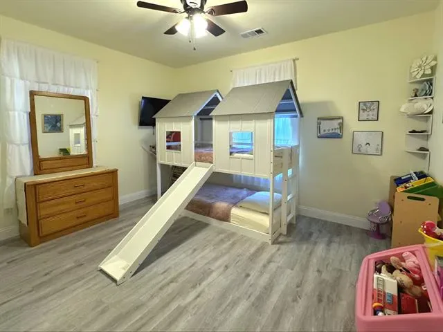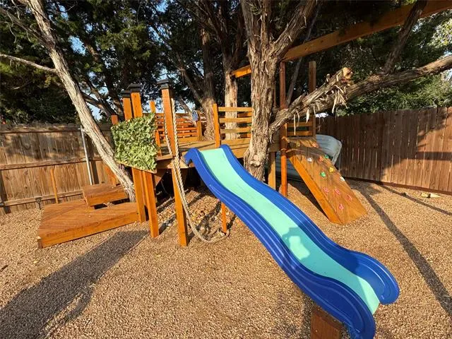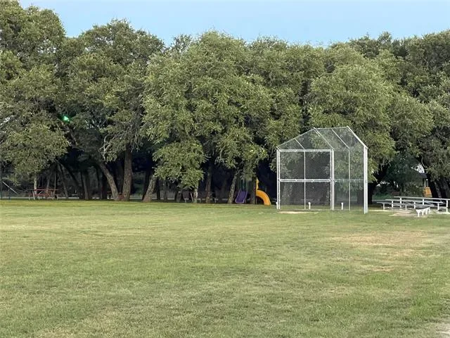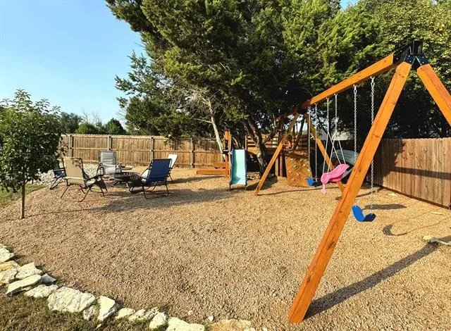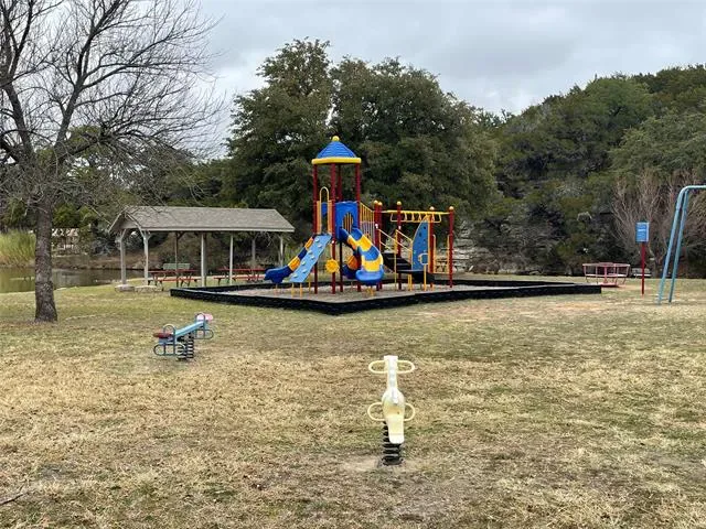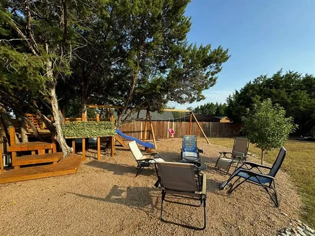 Cozy, beautifully landscaped home minutes from lake Granbury with LOTS of parking. You are minutes from the community boat dock, pool or playground, yet located on a dead end street with minimal traffic. The large backyard is a tranquil paradise offering a custom playhouse, kids play area, firepit area for sun gazing or enjoying those nightly smores, grassed area with sprinklers for the pets with additional fun lightening. The front yard is rocked for low upkeep, has a lovely covered front porch just perfect for enjoying your morning coffee. The home is only partially fenced, seller is willing to add the additional fencing to enclose the back yard with the right offer. Inside you will find upgraded paint, split bedrooms, open concept living, with a large utility room with space for a freezer. The house has gutters, an under kitchen sink water filtration system, is on sewer, with Washer, Dryer & Refrigerator Negotiable. Neighborhood amenities includes a gated entrance, 2 boat docks, 2 play areas, 2 seasonal swimming pools, a baseball field, fishing pier, fishing pond, tennis & basketball courts. STR are allowed. MOTIVATED SELLERS ALL OFFERS WILL BE CONSIDERED.