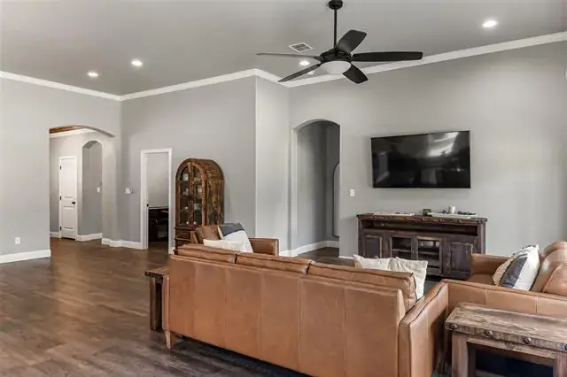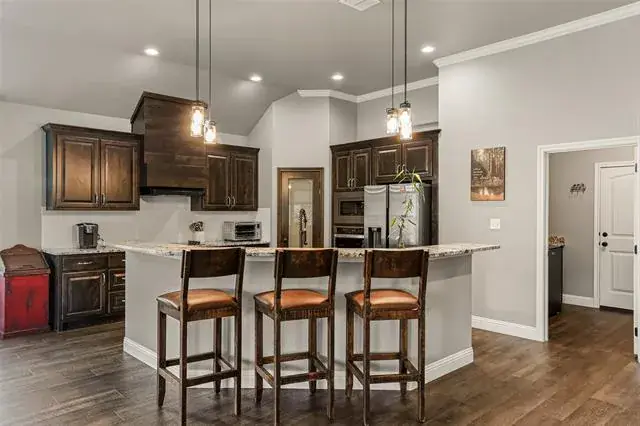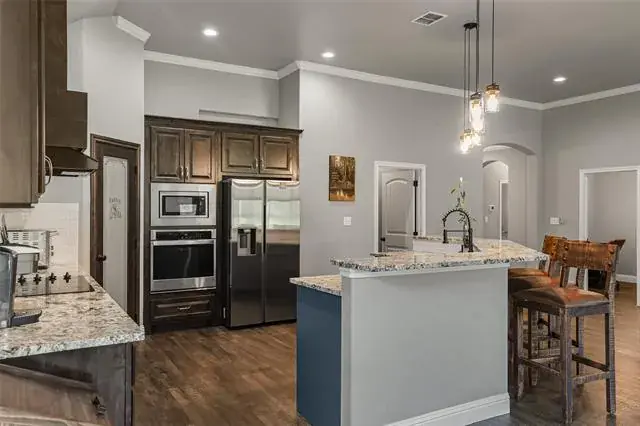 SELLER MOTIVATED! GORGEOUS STONE & BRICK HOME WITH MANY UPGRADES! This beautiful 3 BD, 2.5 BA home sits on .33 acre and features beautiful finishes throughout! You will love the extremely open feeling as you enter under a barrel ceiling with wood accents, and a half bath and an office nearby! The kitchen, living area, and dining area are all open with no walls blocking views or access! The home boasts lots of windows on the back, with nice views of the yard, and a spacious kitchen with stainless appliances! There is granite in the kitchen and all baths, and crown molding in much of the house! Lots of kitchen counter top space for the cook! The master also has a tray ceiling with wood accents, double sinks, and plenty of space! The garage has room for a golf cart or extra tools, toys, or storage. The large covered back patio faces east for shaded afternoon enjoyment! Furniture is negotiable.