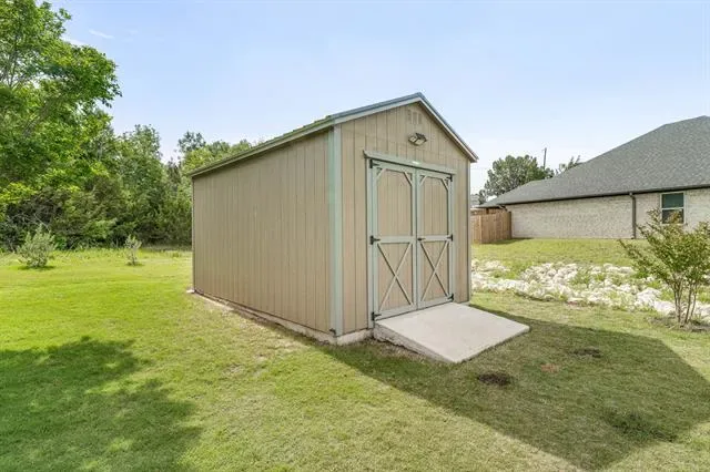 Better than new 4-bedroom home in Canyon Creek—rare for the neighborhood—with an established yard, added privacy, and true move-in ready condition. This well-maintained home offers modern comfort, energy efficiency, and low-maintenance living—plus a transferable builder’s warranty for added peace of mind. Inside, you’ll find beautiful tile flooring throughout and a bright, open-concept layout designed for both everyday living and entertaining. The kitchen features granite countertops, stainless appliances which includes refrigerator, abundant soft-close cabinetry, and excellent prep and storage space. The private primary suite offers dual vanities, a spacious walk-in closet, and a bonus second closet. Three additional bedrooms provide flexibility for guests, a home office, or growing households—something not commonly found in this neighborhood. Designed with efficiency in mind, the home includes sprinkler system, fully encapsulated spray foam insulation, energy-efficient windows, LED lighting, a smart thermostat, insulated garage door with keypad, wrapped water heater, whole-home surge protector, Ring doorbell, and exterior sensor lighting—helping keep utility costs low while enhancing convenience. Enjoy an established yard with green space and enhanced spacing from neighboring homes, creating a peaceful, uncrowded setting. Relax on the covered back patio and take in the quiet surroundings, with the added charm of hearing the nearby creek during seasonal rains.Storage is a standout feature with ample interior space plus a 10×16 on-site storage shed on a slab. Located near the front gate for easy access and just minutes from shopping, dining, and downtown Granbury. Canyon Creek offers gated security, two pools, pickleball and basketball courts, marina access, and a true lake lifestyle. A rare opportunity to own a 4-bedroom home with upgrades, efficiency, privacy, and an established large yard to give you a lot more privacy that a lot of homes in the neighborhood!