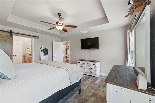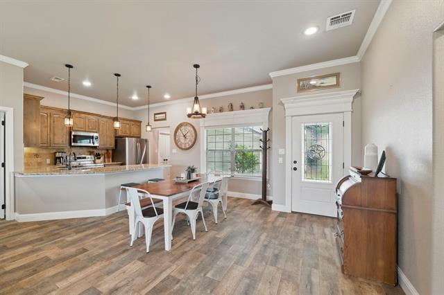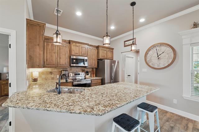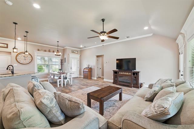 Wonderful one owner home, positioned next to a treed lot that offers added privacy and frequent visits from local wildlife. Inside, the open-concept layout is enhanced by wood-look tile floors, intricate crown molding, neutral colors, and 10ft ceilings. The kitchen stands out with its elegant knotty alder cabinetry, granite countertops, stainless steel appliances, bar seating, and pantry. The dining area anchors the kitchen and living room, providing a communal space that’s perfect for friends and family. The primary bedroom features a tray ceiling, sliding barn door, and an ensuite bathroom with large shower, dual sinks, and generous cabinetry. A large walk-in closet completes this private retreat. Split bedrooms offers space for those that need it, with a convenient guest bathroom right off the living area. Step outside to enjoy the peaceful backyard patio, with the added bonus of a vacant lot behind the home. Owners added full irrigation to keep the lovely landscaping and grass lush through the seasons. Community Amenities include clubhouse, community pool, playground, and tennis courts, gated entrance with 24-7 security and access to the lake with including boat ramps and a fishing pier.