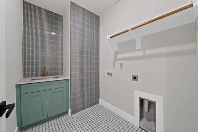 The primary suite, located on the first floor, offers a private retreat with a walk-in closet featuring built-in shelving for optimal organization. The ensuite bathroom is equally refined, complete with a sleek stand-up shower and a modern floating vanity with dual sinks. Also on the main level, you’ll find a convenient half bathroom with a floating vanity and a well-equipped laundry room with full-size washer and dryer connections and a utility sink.