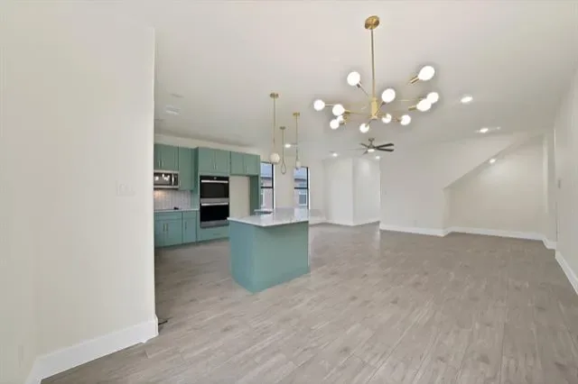 The kitchen is a true centerpiece, showcasing Quartz countertops, a spacious island, abundant storage, and a pantry for added convenience. Outfitted with stainless steel appliances—including a microwave, dishwasher, and double wall ovens paired with an electric glass cooktop.