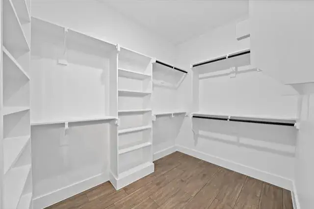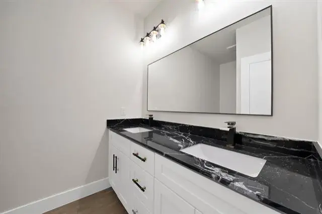 The private primary suite brings comfort and relaxation. It features a large walk-in closet and an ensuite bathroom with dual sinks, dark granite counters, and a sleek glass-encased shower. Three additional bedrooms provide flexibility for guests, family, or a home office, and the second bathroom continues the cohesive design with matching dark granite finishes.
