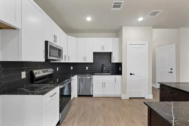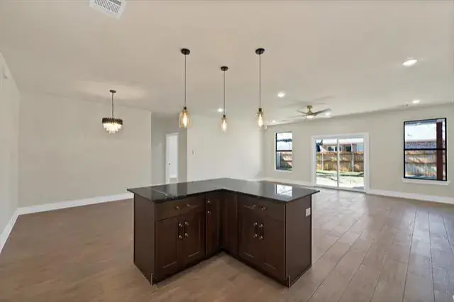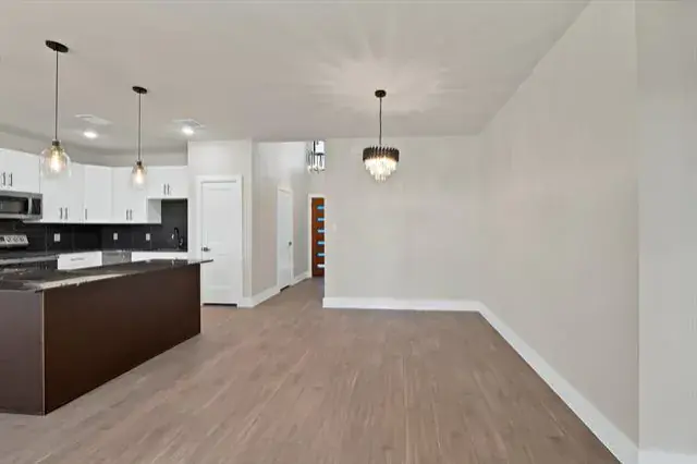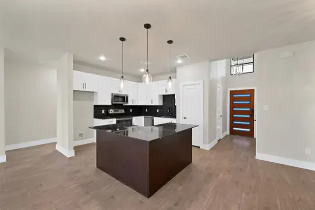 The spacious living area opens directly into a show-stopping kitchen built for gathering. An L-shaped island anchors the space, offering abundant prep room and seating. Dark granite countertops add depth and contrast, while stainless steel appliances—including an electric range, microwave, and dishwasher—complete the clean, contemporary look. Whether you’re hosting friends or enjoying a quiet night in, this open floorplan delivers the perfect setting.