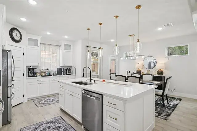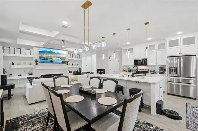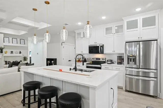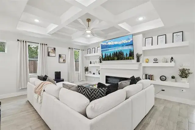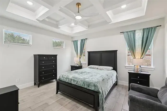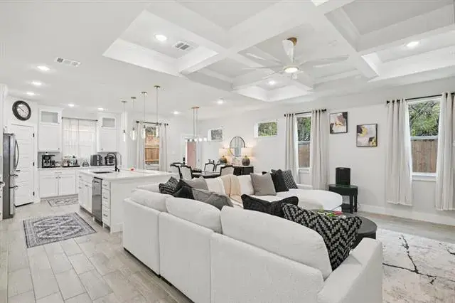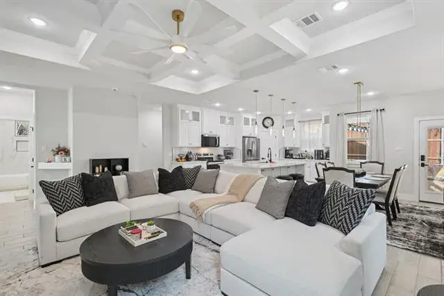 Recently purchased and meticulously maintained, this home feels brand new without the wait for construction. Step inside to a bright, open-concept layout where the living room features elegant decorative ceiling beams, creating a warm and inviting focal point. The private primary suite also showcases striking beam details, adding character and charm to your retreat.