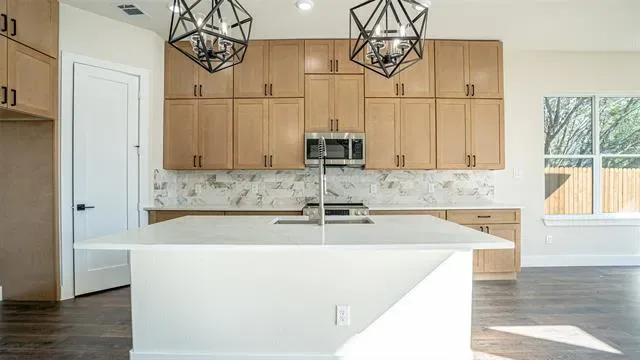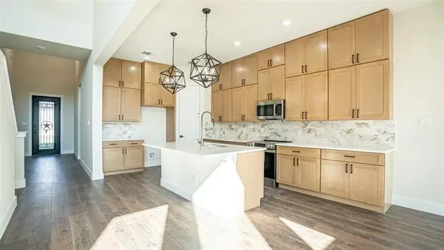 Step into sophistication in this beautifully crafted two-story residence, where thoughtful design meets everyday comfort. Offering over 2,200 square feet of interior space, this 4-bedroom, 3-bathroom home includes a spacious 2-car garage and countless upgrades throughout. From the moment you enter through the grand 8-foot wrought iron doors, you''re greeted by soaring ceilings and an airy layout. The main living area impresses with its dramatic 20-foot ceilings and abundant natural light, creating an inviting space for relaxing or entertaining.Centrally located, the gourmet kitchen is a true centerpiece—equipped with custom cabinets, a generous center island, and upscale finishes that elevate every meal. The luxurious downstairs primary suite offers a tranquil escape, complete with a spa-inspired bath and a sizable walk-in closet. Upstairs, two additional bedrooms each include a private study nook, offering the perfect blend of privacy and productivity for remote work or homework time. Additional features include a dedicated mudroom, well-appointed laundry area with built-in sink, full home spray foam insulation, a complete sprinkler system, and a fully fenced backyard with cedar privacy fencing. Built with durability, energy efficiency, and modern living in mind—this home is ready to impress. Don’t miss the opportunity to see it for yourself!