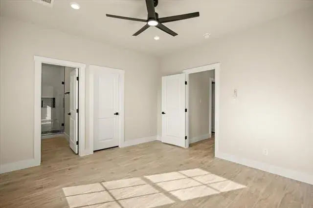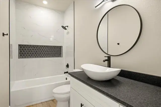 The primary suite offers a relaxing retreat with an ensuite bathroom showcasing dual sinks, dark granite countertops, raised sink bowls, and a glass-enclosed shower. A generous walk-in closet completes the space. Two additional bedrooms are well-sized and share a beautifully finished secondary bathroom with dark granite countertops and raised sink bowls.