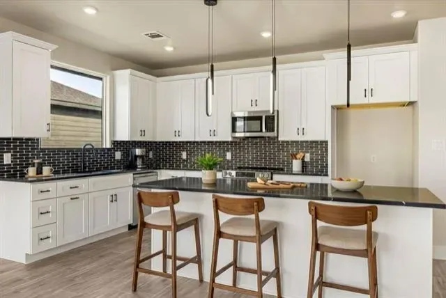 Step inside to a spacious living room anchored by a sleek electric fireplace, creating a warm and inviting focal point. The open flow leads directly into the kitchen, where dark granite countertops provide a striking contrast to the bright space. A large kitchen island offers additional prep space and seating, while stainless steel appliances and abundant cabinetry make this kitchen as functional as it is stunning.