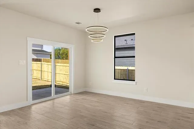 The two-car garage is finished with durable epoxy flooring, adding both style and practicality. Step outside to a covered back porch overlooking a fenced yard—perfect for outdoor dining, entertaining, or simply relaxing under the Texas sky.