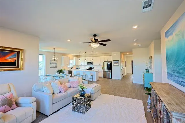 Expansive windows bring in natural light from morning to evening, creating a bright and inviting atmosphere throughout the home. The open concept layout allows for seamless flow between the living, dining, and kitchen areas, with the kitchen serving as the heart of the home, perfect for both everyday living and entertaining.