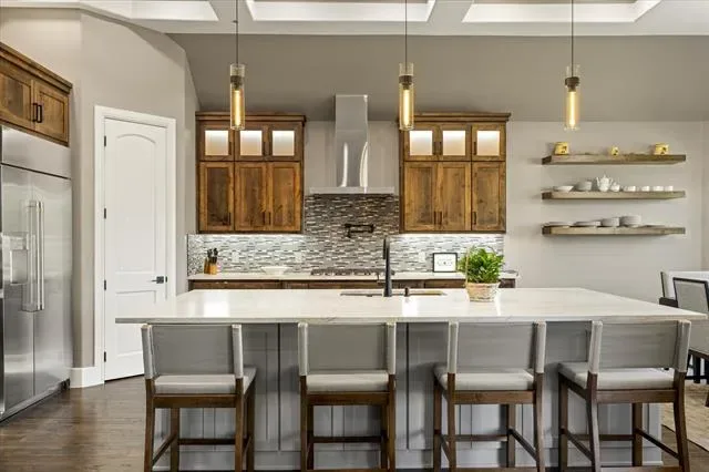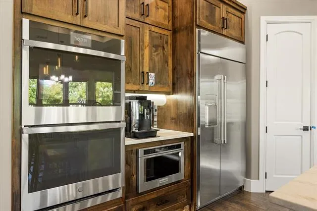 Completely renovated waterfront home on Lake Granbury! Taken down to the studs and rebuilt in 2025 with high-end finishes and thoughtful upgrades throughout. Interior features include engineered hardwood flooring, wood-look tile in wet areas, custom soft-close cabinetry, quartz countertops, custom tile backsplashes, heated bathroom floors, tiled showers with custom glass, and a jetted tub in the primary suite. The chef’s kitchen is equipped with a Café 42 inch built-in refrigerator, GE Profile double ovens with air fryer, KitchenAid microwave drawer, 5-burner cooktop, vent hood, and oversized sink. Elegant touches include designer lighting, under-cabinet and toe-kick lights, stone fireplace with custom mantel, floating shelves, oversized baseboards, and blackout shades.