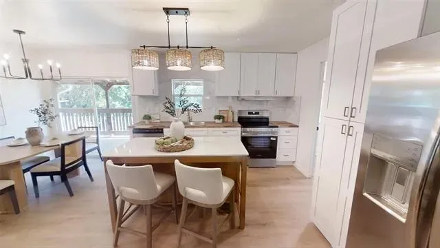 As you walk inside, you’re immediately struck by how open and refreshed the space feels. The kitchen has been completely updated with brand-new shaker-style cabinets in a crisp white finish, complemented by modern light fixtures and a full set of matching appliances that bring everything together, giving it the feel of a site-built home. The living area flows seamlessly from the kitchen, with stylish lighting and new energy-efficient windows that fill the space with natural light.