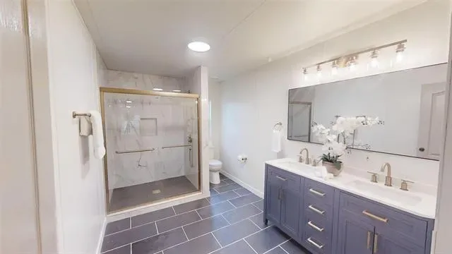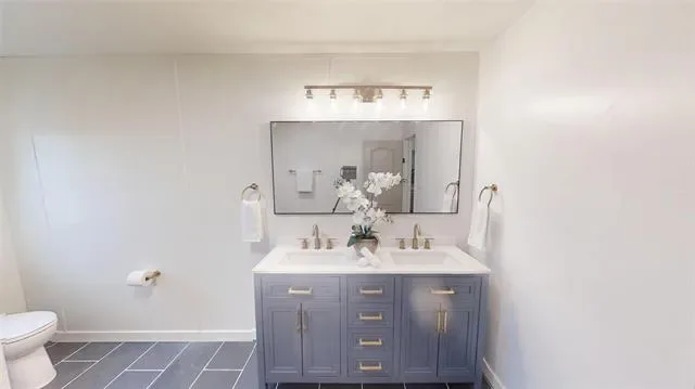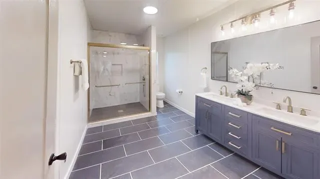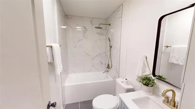 The bathrooms have been fully renovated with new vanities, mirrors, updated lighting, and clean, contemporary fixtures. Showers and tubs have been upgraded with tile surrounds, adding a polished, upscale touch.