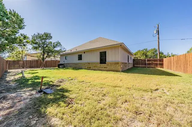Completed new construction home sitting on TWO lots in Granbury, FULLY FENCED! Gorgeous front elevation with the stone exterior and covered porch. Step into this stunning, thoughtfully crafted 3-bed, 2-bath home with laundry room and garage. Granite Countertops throughout. FOAM Insulation, Open Floorplan, luxury vynil plank flooring, and a huge yard! conveniently located only 10 Min from Granbury Lake & Granbury Square. 5 min from shopping.