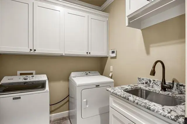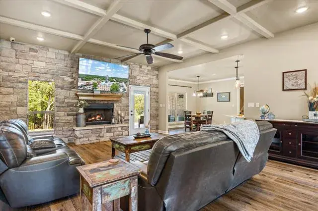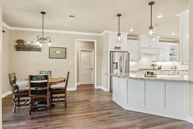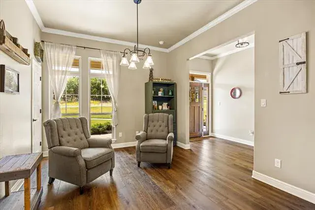 Motivated Sellers! Better than new 2020 Custom Built light and bright modern farmhouse vibe 4 bedroom plus a huge bonus room that could easily be a 5th bedroom, 3.5 bath luxury home with designer touches everywhere you look. No updating needed here! All 4 bedrooms are on the main level with the bonus room and one of the full baths upstairs offering the ultimate privacy for a guest or in law space. Perfectly situated on a half acre lot that backs to heavily treed space offering privacy and a beautiful backdrop for the backyard pool oasis. Welcoming front porch trimmed out with wood plank finishes and ceiling fans. Upon entry you will immediately notice the decorative ceiling treatment and stone feature wall surrounding the gas fireplace, giving the living space an extra cozy feel. Formal dining space would also make a great office or flex area if formal isn’t your thing. Kitchen features white shaker cabinets and upgraded granite counters offering everything the chef in your home desires. Storage galore including built in spice racks, new-never been used wifi enabled oven with air fry option, built in microwave, 5 burner gas cooking and a generous pantry. Primary bedroom ensuite features double vanity, separate shower, soaker tub and 2 walk in closets! HUGE custom closet with a bonus under the stairs storage space and on the other side of the bathroom, another secondary closet too. Large covered outdoor patio overlooks a custom remote controlled salt water pool and attached 7 ft deep spa that backs up to a heavily treed area where a small creek runs through. Entire backyard oasis is fenced and was recently professionally landscaped to address some cosmetic only drainage issues. Oversized 3-Car garage for just about anything you need-see floorplan. Located outside of the city limits so no city taxes either!