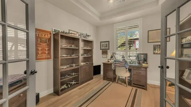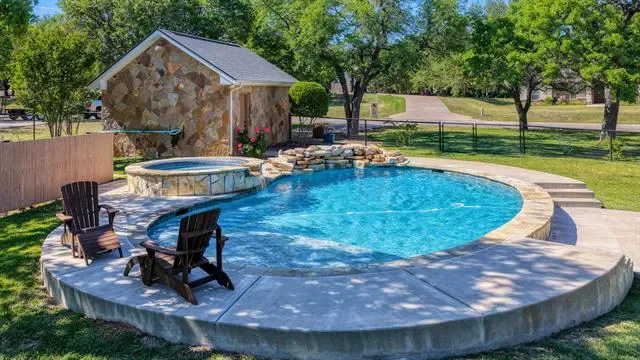 RARE OPPORTUNITY in DeCordova Ranch! This EXCEPTIONAL Show Stopper stands out with a hard-to-find combination: a resort-style pool (2021), a detached WORKSHOP 4th garage, &' nearly 1-acre CORNER LOT, all within a PRIVATE GATED COMMUNITY. Extensively updated with major improvements &' FRESH PAINT offering true move-in-ready peace of mind. Ideal for buyers seeking space, functionality, &' luxury, this home delivers the complete package for indoor-outdoor living &' entertaining—just minutes from Lake Granbury &' downtown Granbury. Sunrise Views &' Resort-Style Backyard, perfectly positioned on a sprawling corner lot beneath TOWERING MATURE TREES. Start your mornings on the expansive front porch. Inside, you’re greeted by rich wood floors, sophisticated finishes, &' custom designed layout featuring two living areas, a formal dining, plus a private office. At the heart of the home, the updated kitchen opens seamlessly to an inviting living area anchored by a striking stone fireplace, ideal for both intimate evenings &' lively gatherings. Tucked away behind double doors, the primary retreat offers spa like luxury, dual vanities, a soaking tub, a separate walk-in shower, &' TWO closets. As the day winds down, enjoy glowing sunsets on screened in back porch &' unwind in the custom pool complete with tanning ledge, cascading waterfall, &' spa. Great functional home featuring a DETACHED WORKSHOP with electricity &' workbench, CIRCLE DRIVE + extensive parking, 3-car garage + 4th garage at shop, Energy-efficient upgrades include spray foam insulation &' TWO TANKLESS WATER HEATERS, &' Smart home features: Ecobee system, &' full gutter system. With extensive updates from 2021-2025( listed in property flyer), every detail has been carefully curated for modern luxury &' peace of mind. *2022: New AC (5-ton Trane)* Located just minutes from Lake Granbury, this home offers elevated living in a serene setting complete with access to nearby private community park &' covered pavilion for residents only.