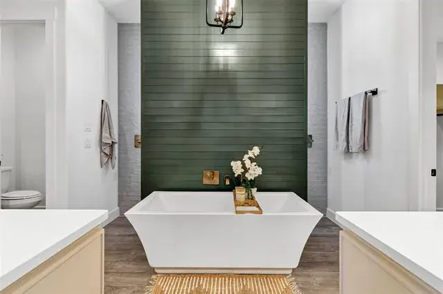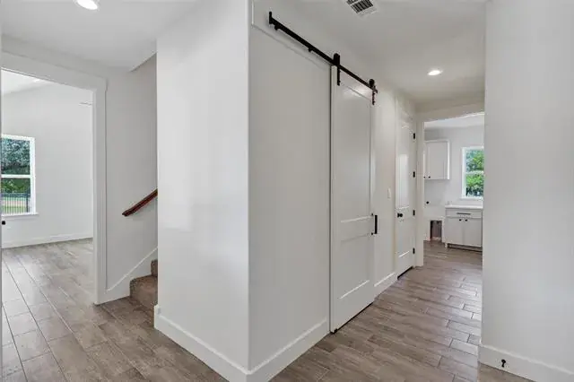 The primary suite is a true retreat with vaulted ceilings, wood beam detailing, and a spa-inspired bathroom complete with a freestanding soaking tub, dual vanities, and a calming, designer feel. An oversized laundry room connects directly to one of the primary closets, creating a layout that supports everyday living with ease.