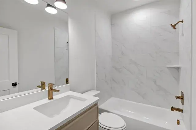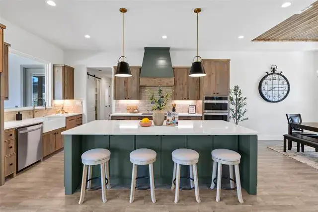 The kitchen and dining areas were designed to feel intentional and connected, featuring custom wood cabinetry, statement lighting, and finishes that carry seamlessly throughout the home. Gold plumbing fixtures and gold and black lighting add a polished touch while maintaining a timeless aesthetic.