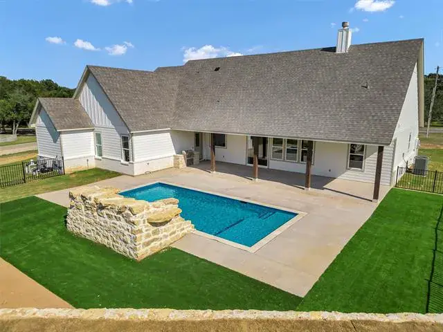 Outdoor living is a standout feature with an expansive covered patio, outdoor kitchen, and a resort-style pool featuring a tanning ledge and dramatic grotto. The setting is ideal for gatherings, relaxation, and enjoying the Texas outdoors.