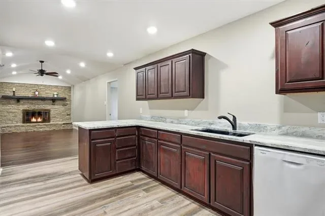 Welcome to 5600 Choctaw Drive, a beautifully updated modern-contemporary home nestled inside the gated community of DeCordova Bend Estates. Thoughtfully refreshed inside and out, this 4-bed, 3.5 bath home blends comfort, warmth, and style in every room. Step inside to an inviting open-concept living area filled with natural light, vaulted ceilings, fresh flooring, and a striking stone fireplace that instantly feels like home. The kitchen shines with rich cabinetry, modern lighting, stainless appliances, and granite counter tops- perfect for hosting or everyday living. A newly reconstructed downstairs primary suite offers the retreat everyone hopes for: a spacious bedroom, large walk-in closet, and a beautifully finished spa-inspired bathroom. Upstairs, generously sized secondary primary bedrooms give family and guest plenty of space to unwind. Fresh exterior paint, upgrades throughout, and a private fenced yard creates a move-in ready home you’ll love returning to. Enjoy peaceful mornings on the patio, evenings by the fire, and all the amentities this premier golf course coummunity offers- security, lake access, clubhouse, pools and more. Charming, updated, and located in a desirable gated community, this home is ready to welcome its next chapter.