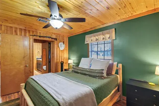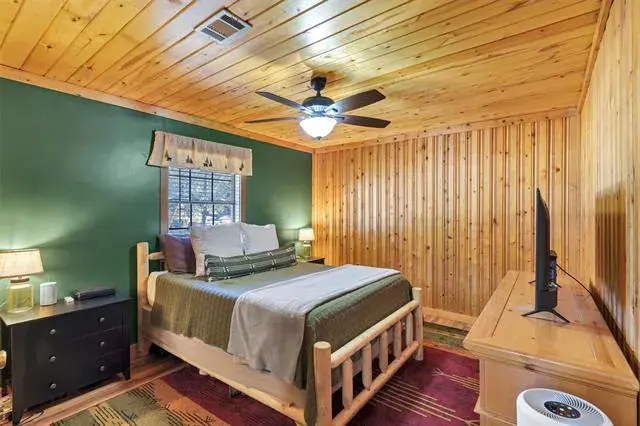 Inside, knotty pine walls and wood accented ceilings create a true cabin atmosphere, anchored by a stunning wood burning fireplace with a floor to ceiling rock wall that serves as the heart of the living space. Wood and tile flooring flow throughout the home, offering both warmth and durability. The living area feels cozy yet spacious, perfect for relaxing evenings or gathering with family and friends.