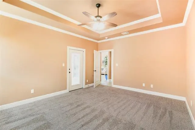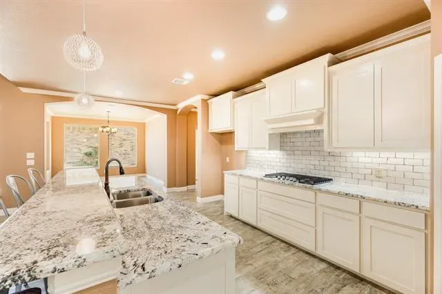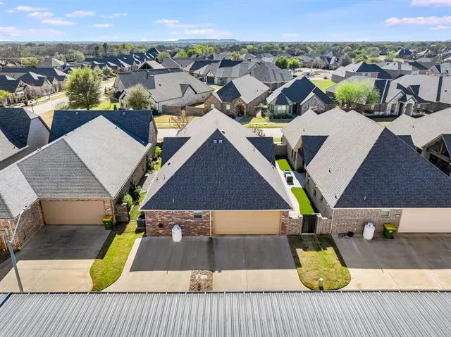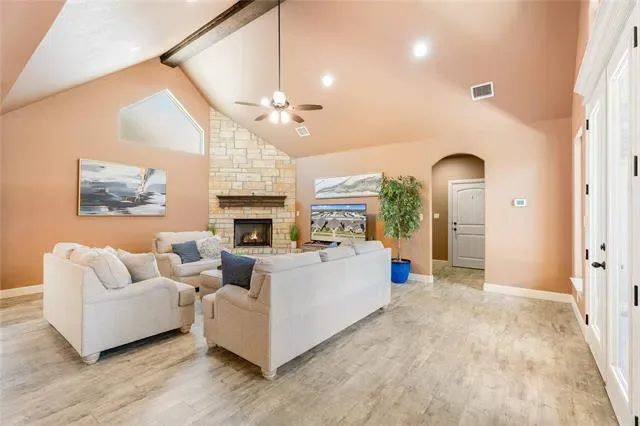 Welcome to effortless living in the gated, sidewalk-lined community of Fountain Village—where comfort, convenience, and low-maintenance living come together beautifully. This thoughtfully designed single-story brick and stone home offers 3 bedrooms, 2 bathrooms, and a 2-car garage, all surrounded by beautifully landscaped grounds. Step inside to an open-concept layout filled with natural light, soaring vaulted ceilings, and large windows that create a bright, airy feel. Wood-look tile flooring throughout the main living areas adds both style and durability. The spacious living room is anchored by a stunning floor-to-ceiling stone fireplace, complemented by a wood-beamed vaulted ceiling and matching mantle that adds warmth and character. The kitchen is designed for both everyday ease and entertaining, featuring abundant granite countertops, white cabinetry, double ovens, a gas cooktop, built-in microwave, breakfast bar seating, and a generous walk-in pantry. It flows seamlessly into the dining and living areas, making gatherings feel natural and comfortable. The private primary suite is a relaxing retreat with direct access to the patio—perfect for morning coffee or quiet evenings. The ensuite bath offers dual vanities and a large walk-in shower with dual sprays for a spa-like experience. Two additional bedrooms provide flexibility for guests, hobbies, or a home office. Enjoy outdoor living under the stunning vaulted ceiling of the large porch inside the fully fenced, low-maintenance yard designed for privacy and relaxation. A spacious laundry room with sink adds everyday convenience. Foam insulation enhances energy efficiency and year-round comfort. The HOA enhances the easy living lifestyle by maintaining the front yard, gated entry, and trash service, while also offering a community pool and clubhouse for socializing and recreation. Move-in ready and designed for easy living—this home lets you spend less time maintaining and more time enjoying life.