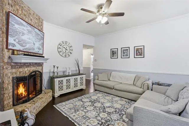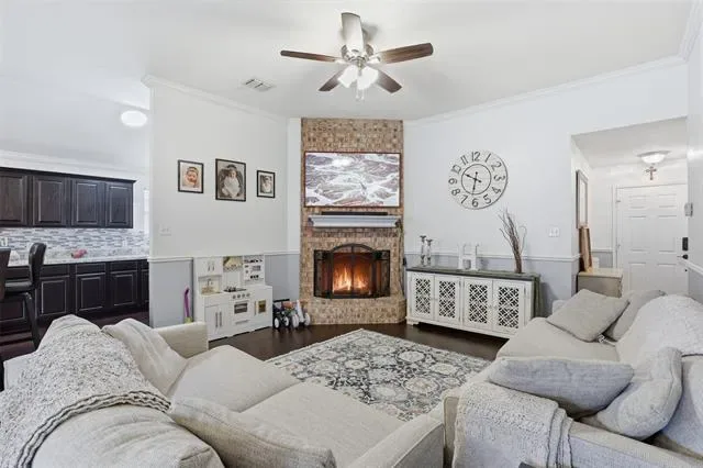 The living room is anchored by a cozy wood burning fireplace, creating the perfect gathering space for relaxing evenings or entertaining guests. The kitchen features a large island, providing additional prep space, seating, and functionality for everyday living.