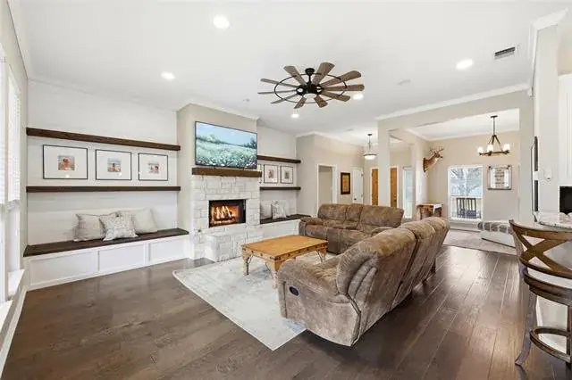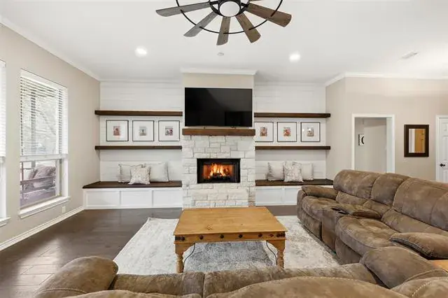 The spacious primary suite is a true retreat, featuring an ensuite bath with two walk-in closets, a vanity area, and a large walk-in shower. The living room is warm and inviting with gorgeous shiplap walls, floating shelves, built-in storage benches, and a gas fireplace as the focal point.