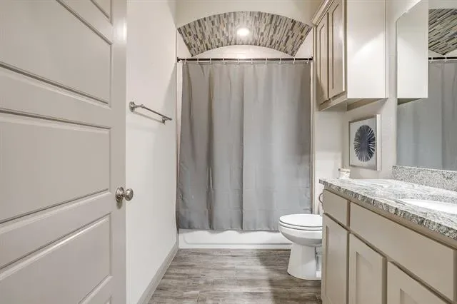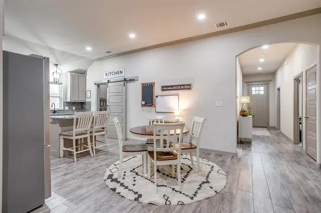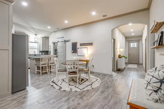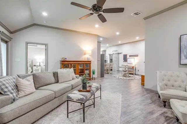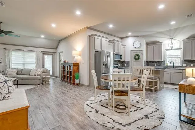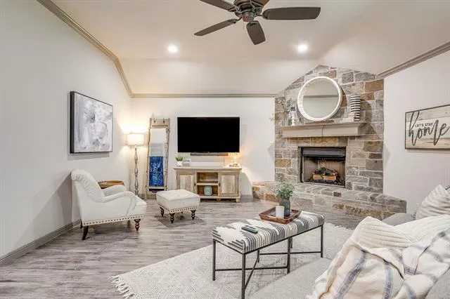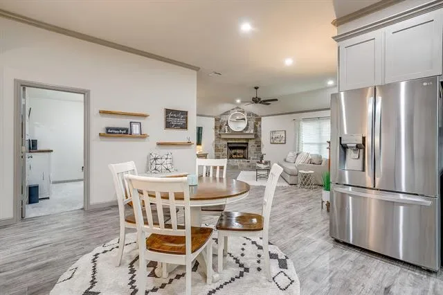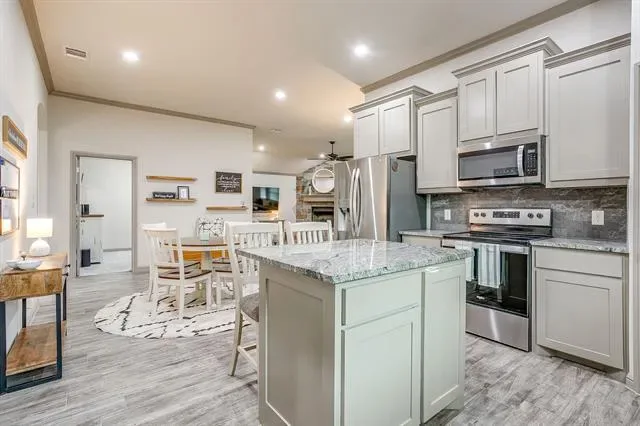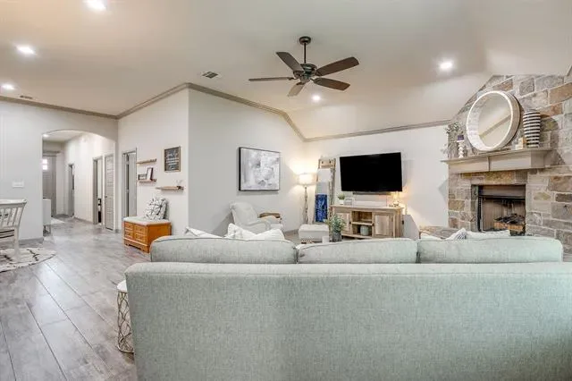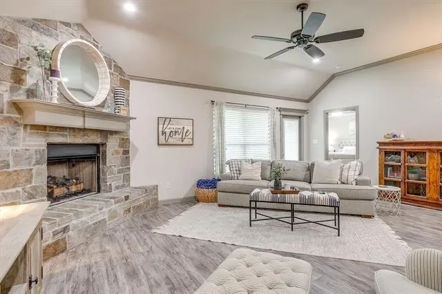 Step inside to an open floor plan filled with natural light and stylish finishes. The spacious living area is anchored by a dramatic floor-to-ceiling rock, gas log fireplace—perfect for cozy evenings and entertaining guests. Wood-look tile flooring flows throughout all main living areas, combining durability with a warm, upscale feel.