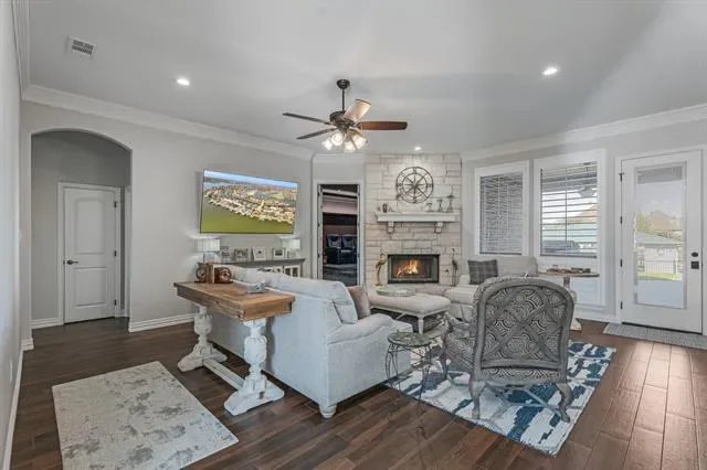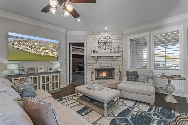 Positioned on a premier corner, lakefront lot in the sought-after, sidewalk-lined Harbor Lakes community, this exceptional single-story home delivers a lifestyle that feels effortless yet extraordinary. Set along a peaceful canal with a short ride to the main body, the location balances serenity &' recreation, with scenic walking paths along the water for morning strolls or evening sunsets. More than move-in ready, this home is curated with top-tier finishes &' thoughtful design that elevate everyday living. The kitchen is a dream, equipped with a Thermador gas cooktop, Electrolux ovens with micro &' convection features, Bosch dishwasher, Scotsman ice maker, offering elegance &' room to create. The private primary suite offers a true retreat with a cozy sitting area &' spa-inspired ensuite featuring a wet room with rain shower, soaking tub, &' electric fireplace. A dedicated office provides the perfect work-from-home space, while two additional bedrooms—including one tailored for crafting or sewing—offer flexibility. The bunk room is a standout, complete with four built-in bunks, individual lighting &' charging stations, plus an adjoining bedroom &' shared bath. Designed for entertaining, the custom home theater includes a Black Diamond screen, Sony 4K projector, SVS subwoofers, Denon AVR receiver, two rows of powered seating, blackout blinds, &' customizable lighting for the ultimate cinematic experience. Step outside to your private oasis featuring a large covered patio, built-in grill, bar seating, &' fully fenced yard. The impressive dock boasts three lifts accommodating a bass boat, pontoon, jet skis, &' more. Oversized 3-car garage includes a 220 plug for EV charging, workspace &' ample room for boats or trucks, plus abundant off-street parking. A professionally installed WiFi system &' camera system ensure seamless connectivity from the home down to the dock &' water. With premium appliances, luxury features, &' unmatched lakefront living—this home truly has it all.
